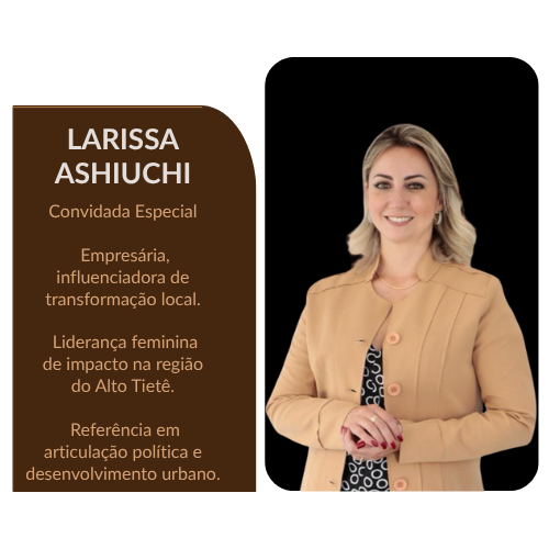 Larisa Ashiuchi – Empresária, líder política e influenciadora de transformação local, Larisa é uma das principais vozes femininas da região do Alto Tietê. Reconhecida por sua capacidade de articulação e liderança em projetos de desenvolvimento urbano, ela compartilhará sua trajetória e os desafios enfrentados na construção de uma liderança inclusiva e de impacto real.